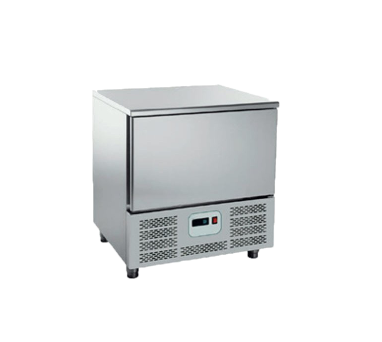 Abatidor de temperatura de sobremesa con exterior en acero inoxidable y acabado satinado. Cuenta con control de ciclos mediante termostato con alarma sonora al final del ciclo y sonda de temperatura son calefactados.