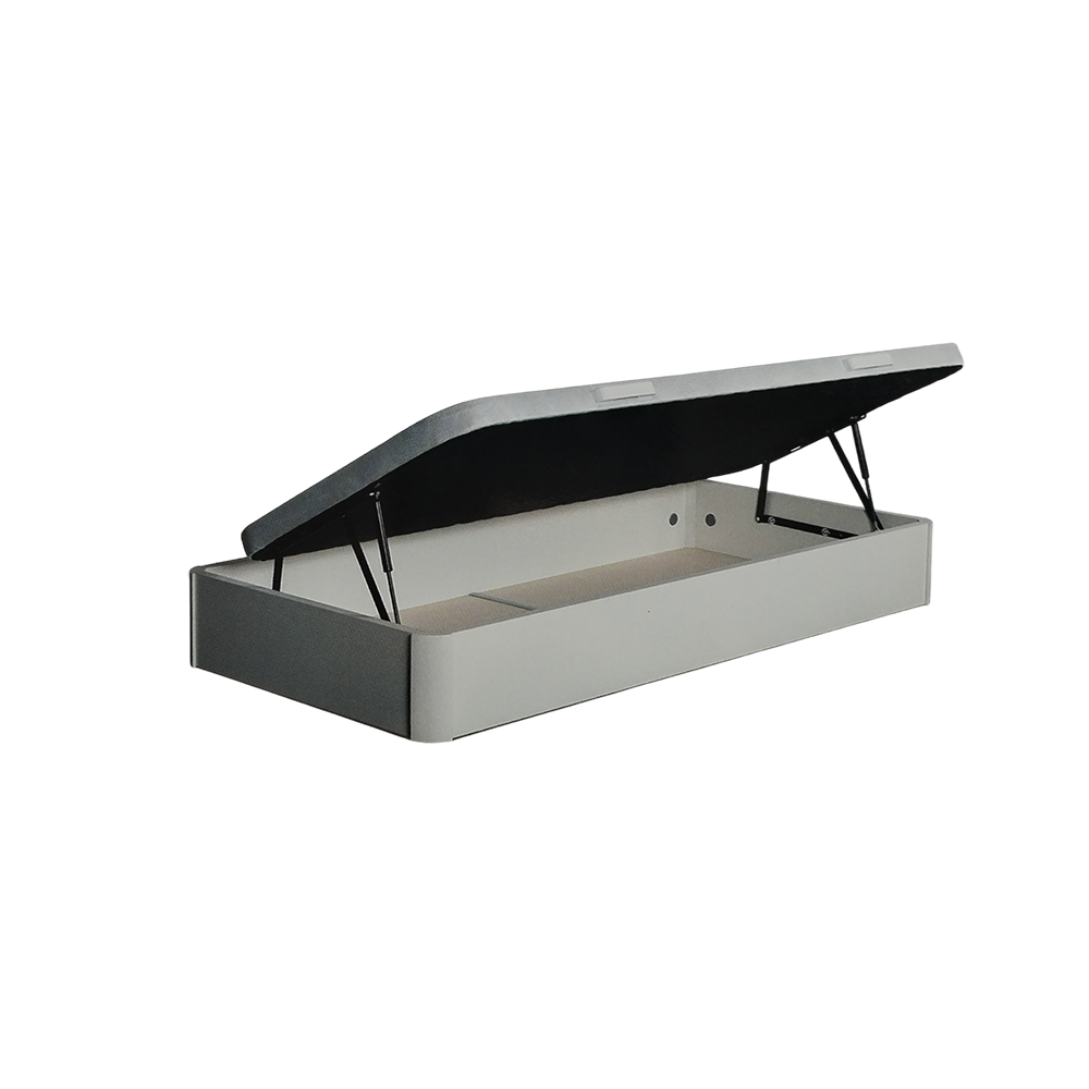 Canapé de apertura lateral con acabado en melamina. Su estructura de arcón está fabricado en tablero melamínico de 30mm con canteado en PVC. Las patas son macizas de haya lacadas y el fondo del canapé de tablero de melamina de 16mm. Los tiradores son de haya a juego con el cajón y sus bisagras motorizadas con mando con y sin cables.