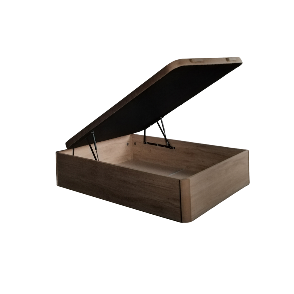 Canapé modelo Denver Plus con acabados en melamina, estructura de arcón fabricada en tablero melamínico de 30mm y patas en PVC. El fondo del canapé es de tablero de melamina de 16mm de espesor con tiradores de haya a juego.