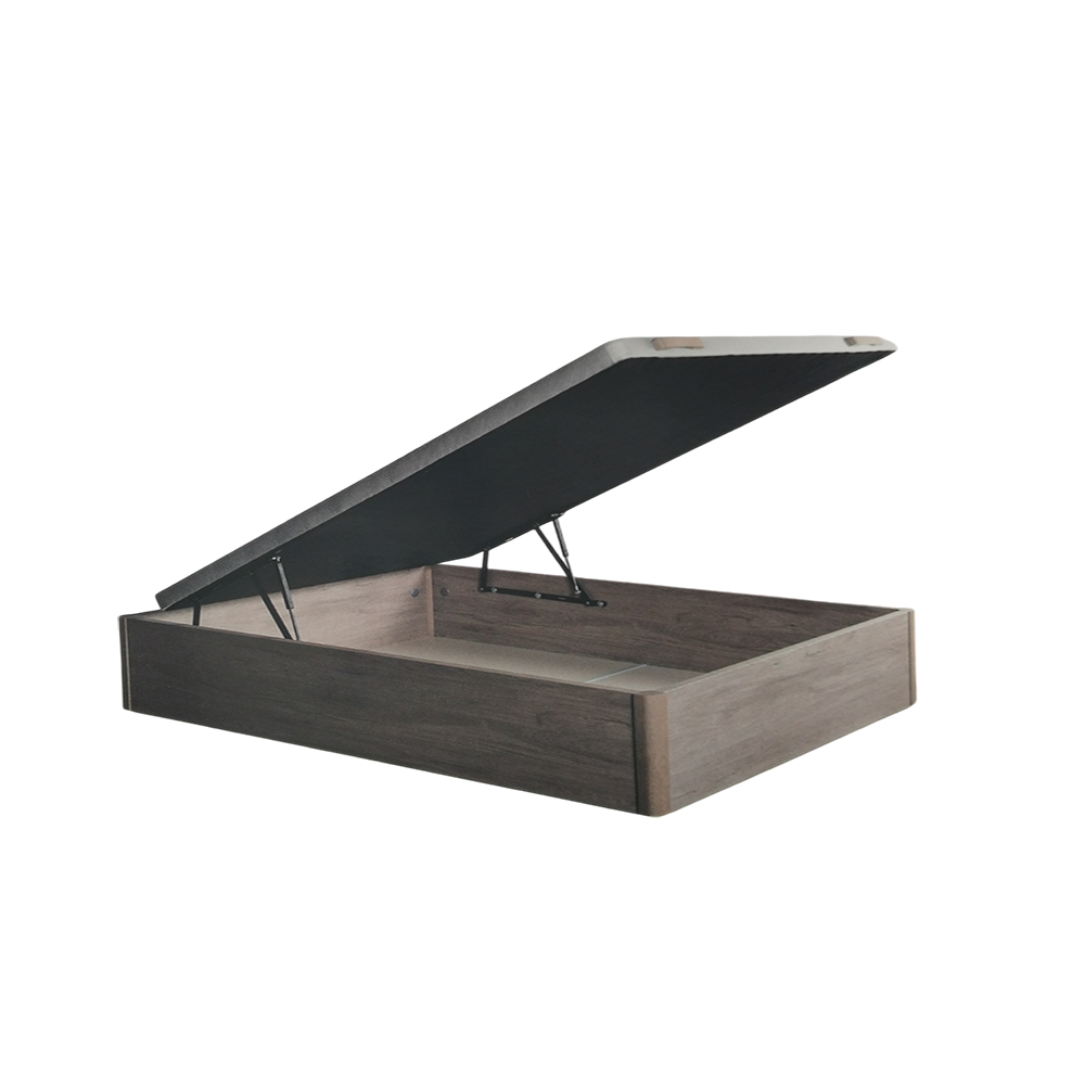 Canapé modelo Niza Plus con acabados en melamina, su estructura de arcón está fabricada en tablero melamínico de 30mm y con canteados en PVC. Además el fondo del canapé es de tablero de melamina de 16mm y sus tiradores son de haya a juego con el cajón.