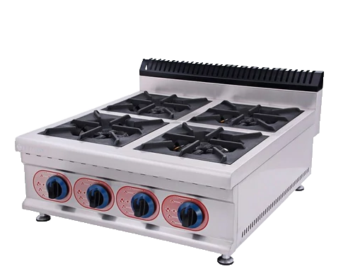 Cocina a gas de sobremesa con cuerpo en acero inoxidable y hierro fundido de alta resistencia. Cuenta con encendido piezoeléctrico, llama piloto y patas ajustables.