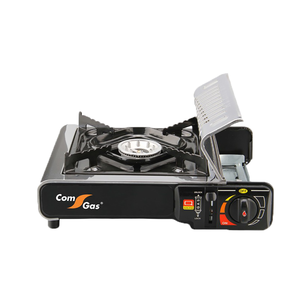 Cocina compacta de ComGas modelo BS102 con cartucho de gas incorporado, maletín de plástico para su transporte, encendido piezo eléctrico, válvula de gas con doble seguridad. parrilla fija, cuerpo en acero inoxidable y nueva apertura del alojamiento del cartucho para un uso más seguro.