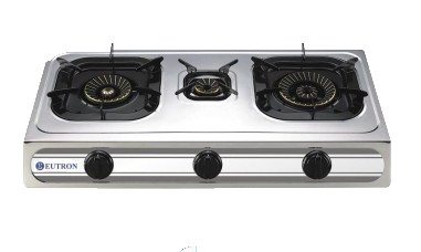 Cocina de gas de sobremesa con 3 fuegos y panel de acero inoxidable. La tapa del quemador es Rotary Negro. Cuenta con válvula de gas de seguridad termopar.