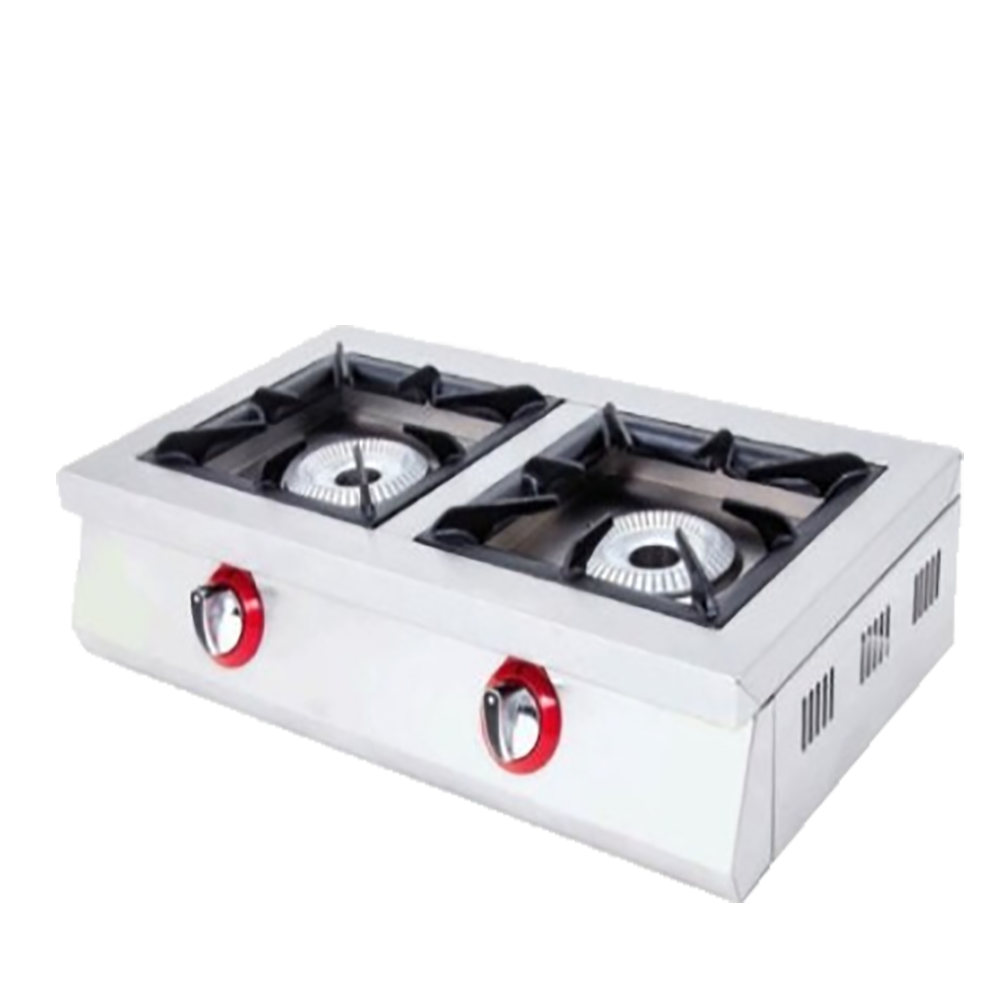 Cocina a gas de sobremesa modelo 7928E con estructura en acero inoxidable, válvula de gas de seguridad con termopar, sistema de inspección del fuego y llama piloto.