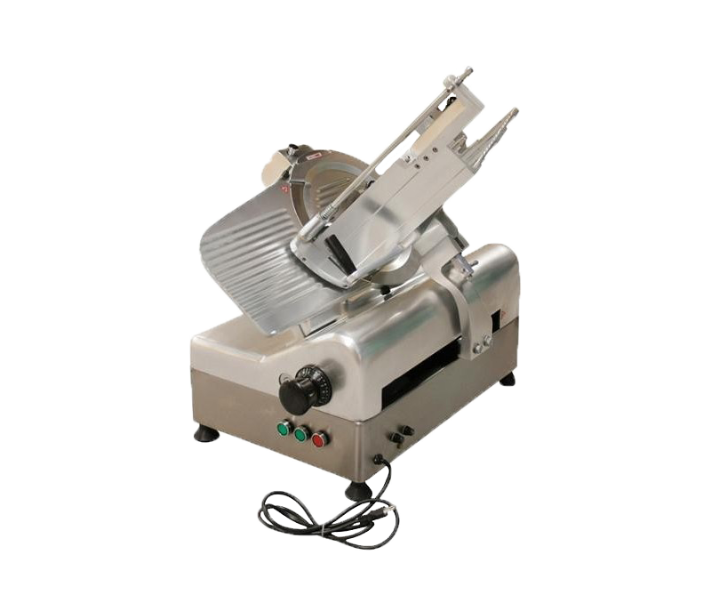 Cortadora de fiambre en aluminio anodizado y pulido. La transmisión de la cuchilla es con engranajes y la del carro por correa.