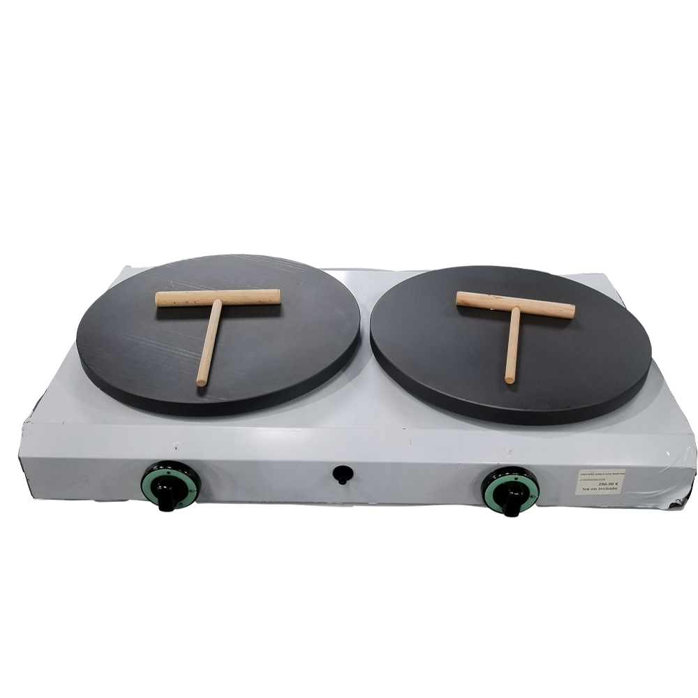 Crepera de gas doble de Resistor fabricada en acero inoxidable con platos anti-adherentes con pulido especial, regulación de temperatura y válvula con sistema de seguridad por termopar.