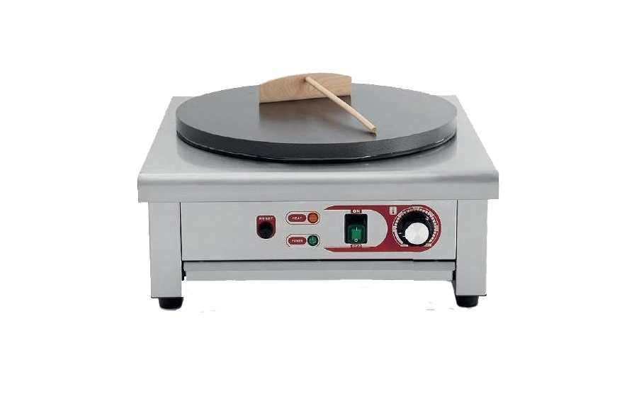 Crepera eléctrica simple con placa calentadora. Cuenta con termostato para la regulación de la temperatura y control automático de la estabilidad de la temperatura. Incluye banda interior recoge grasas.