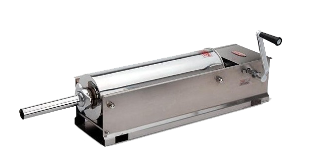Embutidora hidráulica manual en horizontal de acero inoxidable y manivela de aluminio.