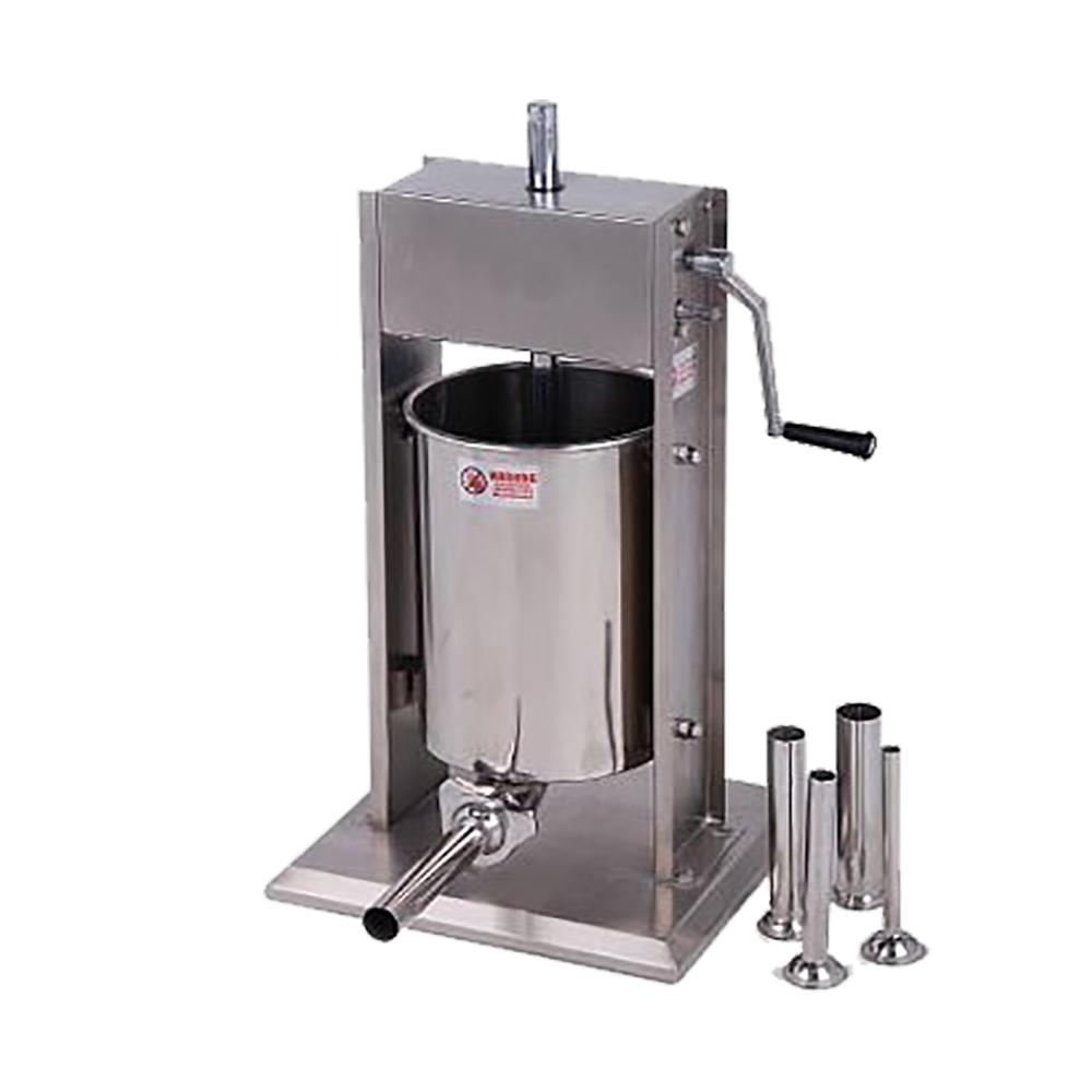 Embutidora hidráulica manual en vertical de acero inoxidable y manivela de aluminio.