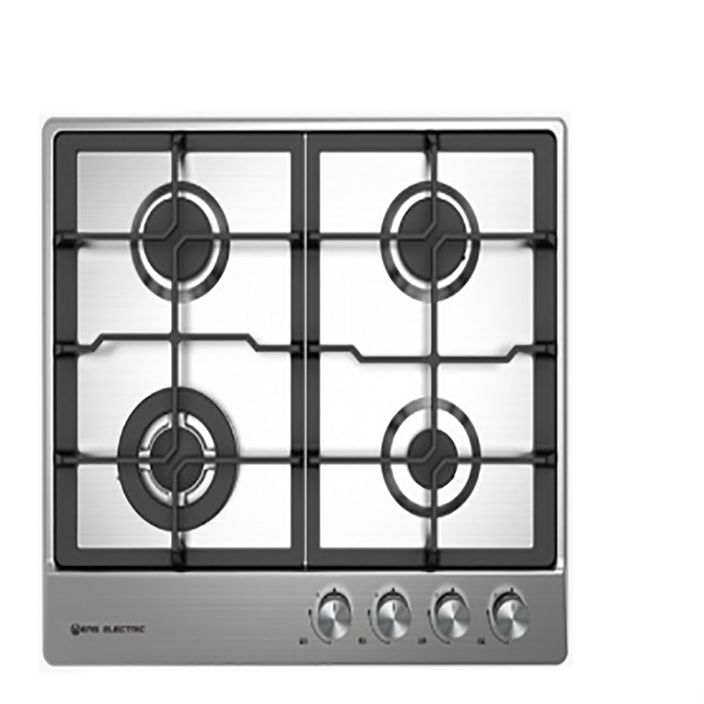 Encimera inox con mandos color plata y auto-encendido. Cuenta con válvula de seguridad en quemadores y sistema de control mecánico. Está preparado para gas butano e incluye Kit de gas Natural.
