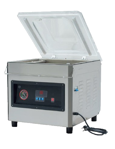 Envasadora al vacío de sobremesa en acero inoxidable con tapa transparente y control de panel digital. Cuenta con soldadura neumática.