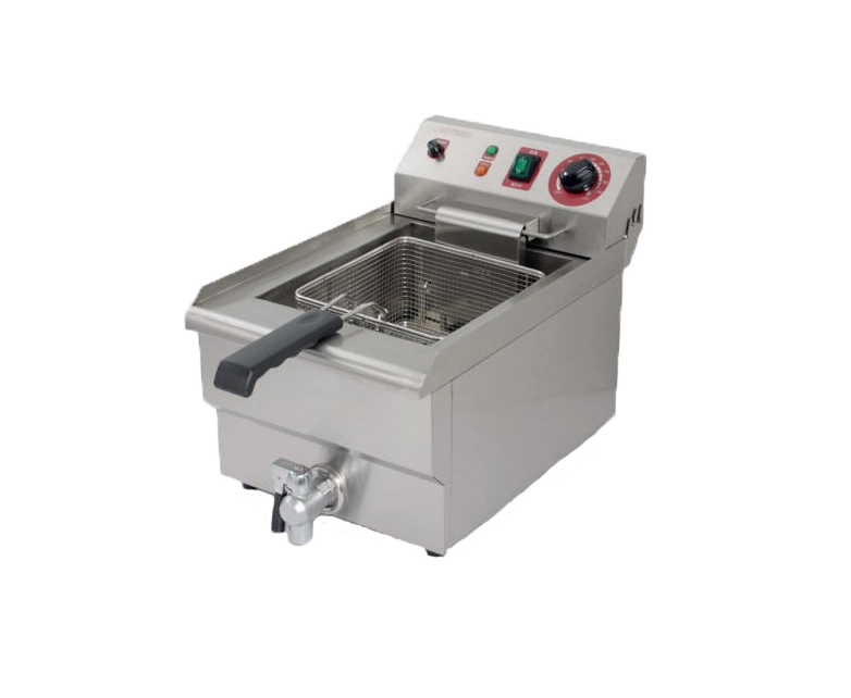 Freidora eléctrica simple con cuerpo en acero inoxidable. Cuenta con cuba fija y grifo de vaciado. Dispone de termostato EGO, Contactor y micro-interruptor.