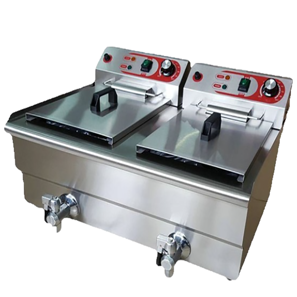 Freidora con cuba fija y grifo de Eutron modelo 10+10 1613p fabricado en acero inoxidable, termostato de trabajo y termostato de seguridad rearmable desde el exterior.