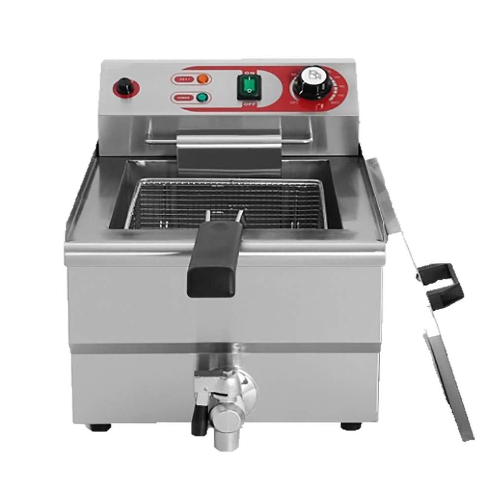 Freidora de cuba fija simple con grifo de Eutron modelo EF-131V fabricada en acero inoxidable, termostato de trabajo y termostato de seguridad rearmable desde el exterior.