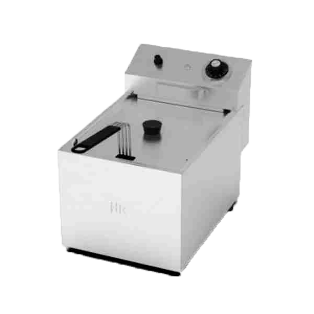 Freidora eléctrica de HR modelo FD8LS de sobremesa sin grifo y monofásica. Está fabricada en acero inoxidable, dispone de termostato de trabajo regulable y termostato de seguridad, piloto metálico LED ámbar e indicador de funcionamiento de la resistencia.