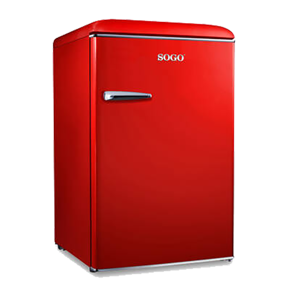Frigorífico mini-nevera de SOGO modelo SS-21955 retro con cesta de cristal para verduras con tapa de cristal, estantes de cristal, bandeja para huevos y soporte para cubitos de hielos.