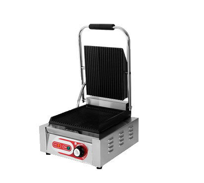 Grill eléctrico de un cuerpo con estructura en acero inoxidable. Cuenta con termostato de temperatura con rango de 50ºC a 300ºC. Las placas del grill son esmaltadas, la placa superior e inferior acanalada y cajón recogida de grasas extraíble.