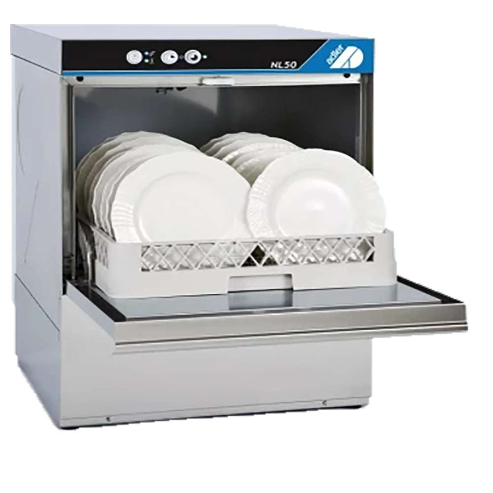 Lavavajillas industrial Adler modelo NL50 con interfaz de usuarios electromecánico con brazos de lavado y aclarado independientes y dosificador de abrillantador incorporado.