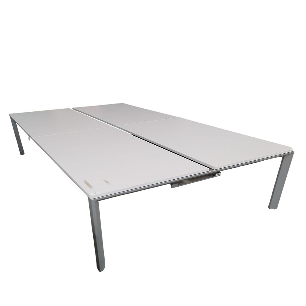 Mesa de trabajo de 4 puestos con patas en aluminio y tablero en color blanco.