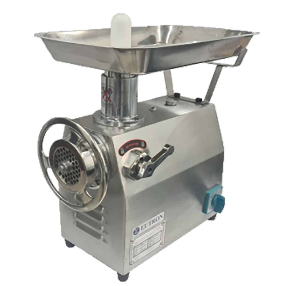 Picadora de carne de Eutron modelo MG22C fabricada en acero inoxidable con boca sinfín y tuerca en acero inoxidable.