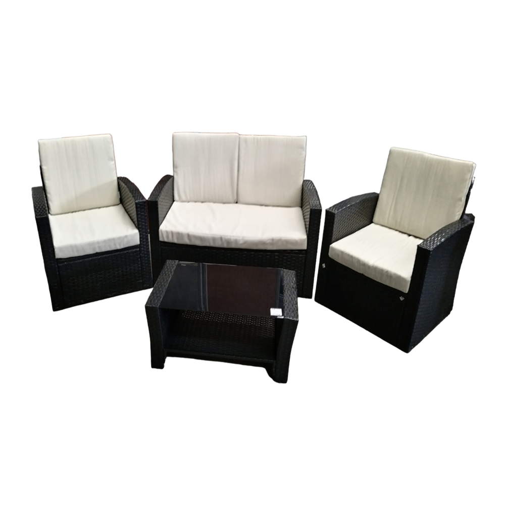 Set relax modelo Aura de fibra con mesa central con cristal, dos sillones y un sofá de dos plazas.