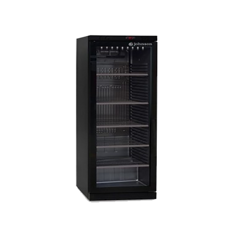 Vinoteca de Johnson modelo JRVN373 con sistema de refrigeración ventilado, control electrónico con Display LED en la puerta, puerta de vidrio doble templado abatible y estantes.
