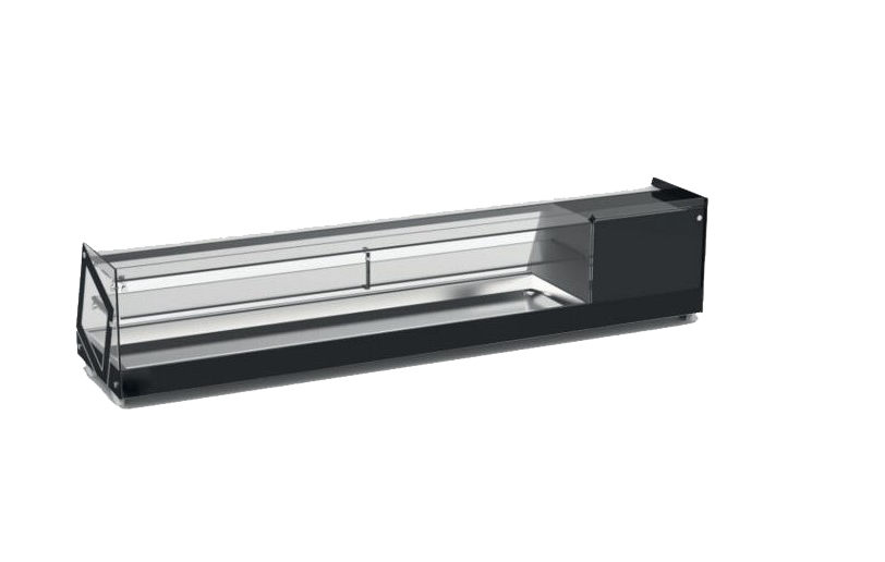 Vitrina refrigeradora para tapas con diseño panorámico para una máxima visión. Cuenta con puerta trasera corredera y estante intermedio de cristal.