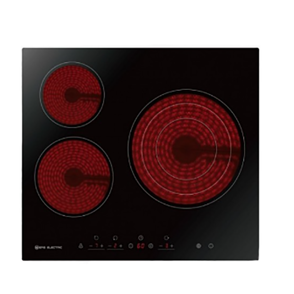 Vitrocerámica de cristal negro con control táctil independiente para cada zona y cantos redondeados. Cuenta con bloqueo infantil e indicadores de calor residual.